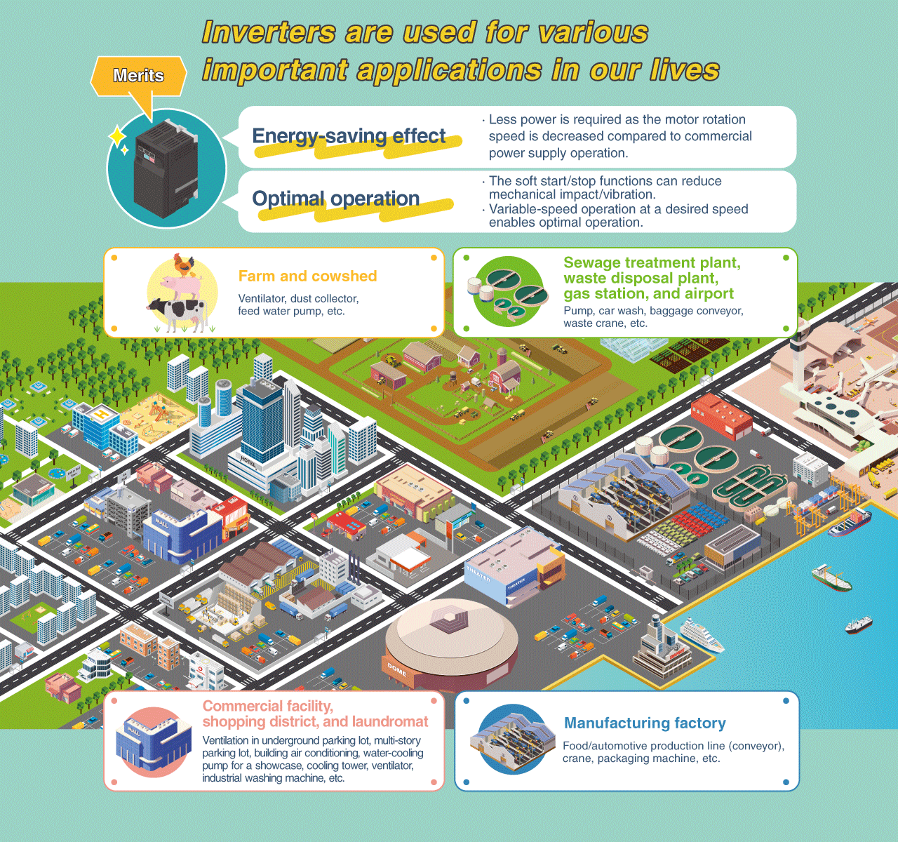 Inverters are variable frequency power supply units which can change the rotation speed of the three-phase induction motors easily and flexibly.