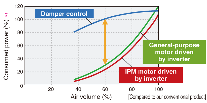 Compared to commercial power supply operation, significant energy savings can be gained by decreasing the rotation speed.